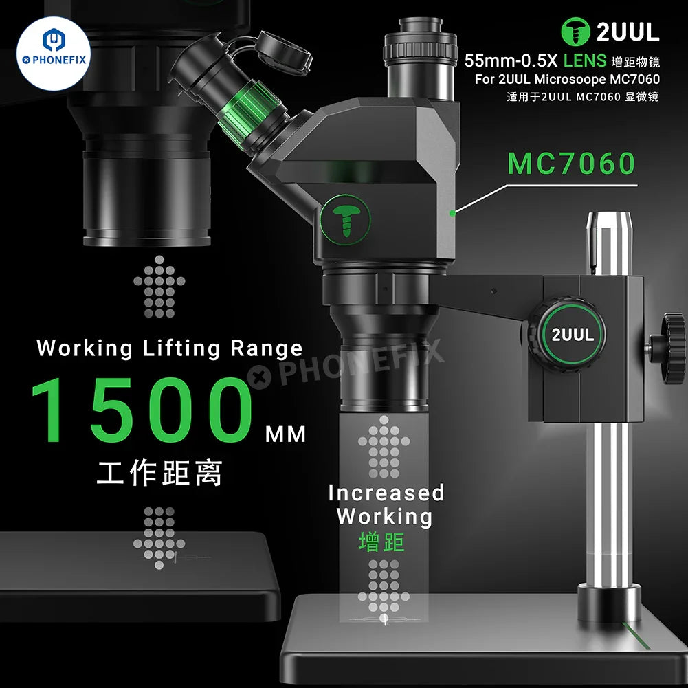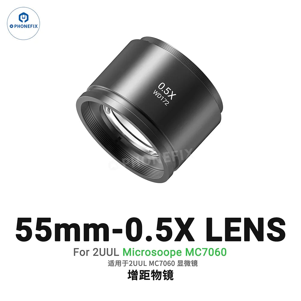 Microscopio stereo trinoculare con zoom sincrono 7X-60X 2UUL MicroScope MC7060-A1 per lavori di microsaldatura PCB di telefoni cellulari. Microscopio trinoculare 7-60X 2UUL con oculari WF10X/23 mm, adattatore per obiettivo CTV 0.5X, lampada ad anello regolabile e ultima base, può essere utilizzato con telecamere HDMI 4K, adatto per la saldatura e la riparazione di chip BGA CPU su schede madri di telefoni cellulari e altri prodotti elettronici. L'obiettivo 05X 2UUL MS0.5 WD172 da 55 mm viene utilizzato con il microscopio 2UUL MC7060 per aumentare la distanza di lavoro, semplificando i lavori di saldatura.